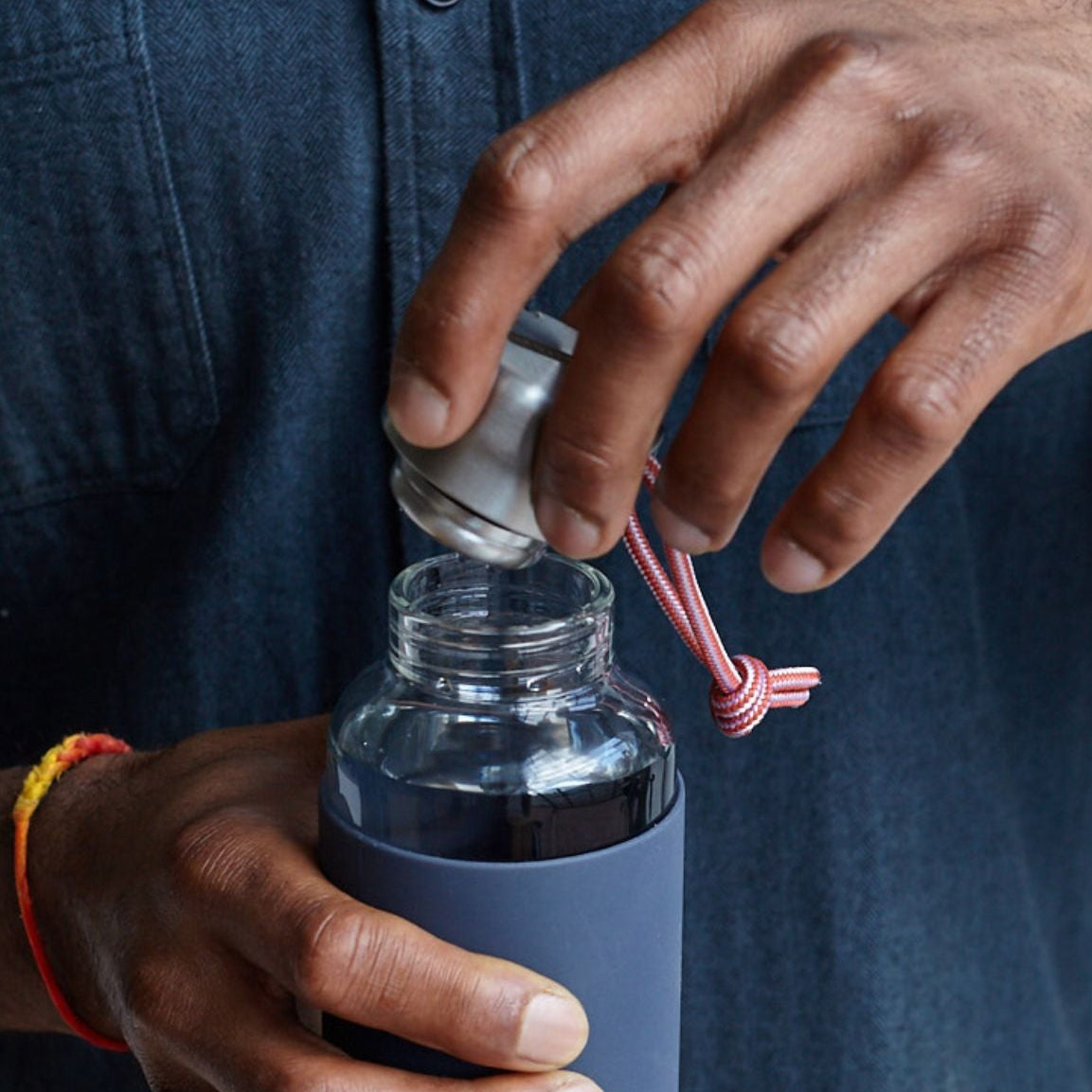 There is something lovely about drinking water from glass. It makes the water taste fresh, crisp, and clean. We wanted to create a minimal glass bottle design that celebrates this. It was a challenge to hand blow a glass bottle with a thread on the inside, but working closely with the skilled artisan makers, we were able to achieve a spout design that was a pleasure to drink from. The stainless steel top and paracord loop give the design a utilitarian feel and the silicone sleeve provides a reassuring grip and protection to offset the fragility of the glass. The end result is a pure, no-nonsense design that will age well and can become your everyday bottle that you will enjoy using for a lifetime.