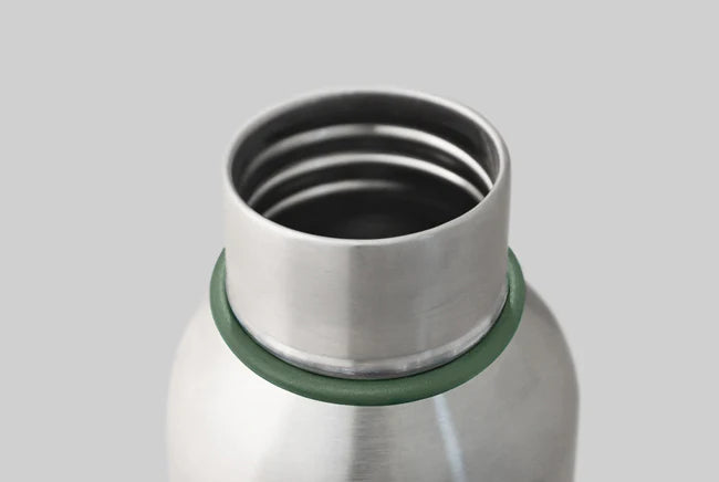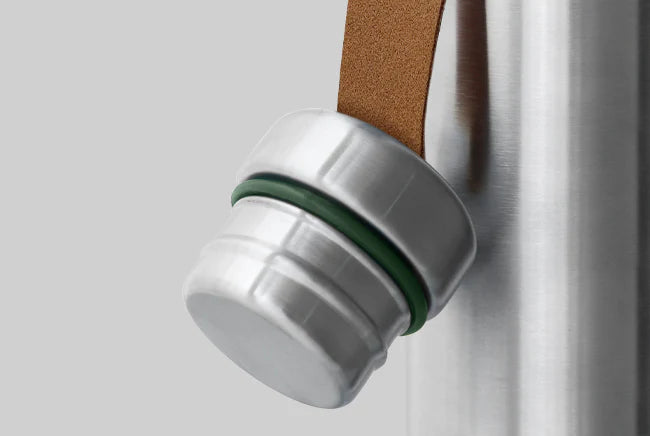 the same and rely on fashion-led colour and pattern/graphics to give them appeal. We wanted to create a design that was more unique and timeless. The simple brushed stainless steel form contrasted by the faux leather strap gives it a modern retro appeal. Any scratches or dents will only add to its charm as it ages. We’ve added only a hint of colour in the silicone seal and ring which holds the strap to ensure the focus is on the materials. This bottle has a utilitarian appeal, designed to be used every day in any environment.